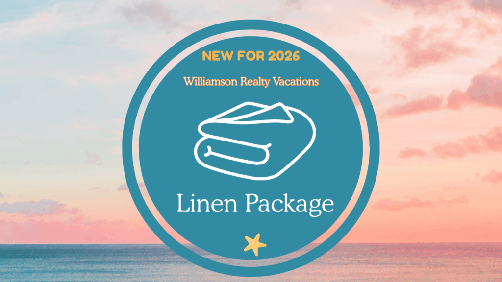 Williamson Realty Vacations is excited to announce a new linen policy. Beginning 2026, linens will be provided with most reservations. Freshly laundered sheets, pillowcases, bath towels, bath mats and washcloths will be delivered to the rental unit on the day of check-in. The linen package will normally be dropped off outside the entrance door of the rental for your convenience. Deliveries may be later than check-in time during the busy season.