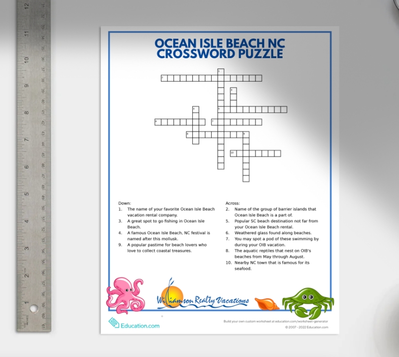 Are you looking for a great way to keep the family entertained in the car or on the plane on the way to your Ocean Isle Beach vacation? We’ve got you covered! This free, printable OIB crossword puzzle will keep the kids and kids-at-heart occupied. It’s also a wonderful activity for when everyone needs some quiet time in your Ocean Isle Beach vacation rental. Print a few copies and have them ready when you need them.